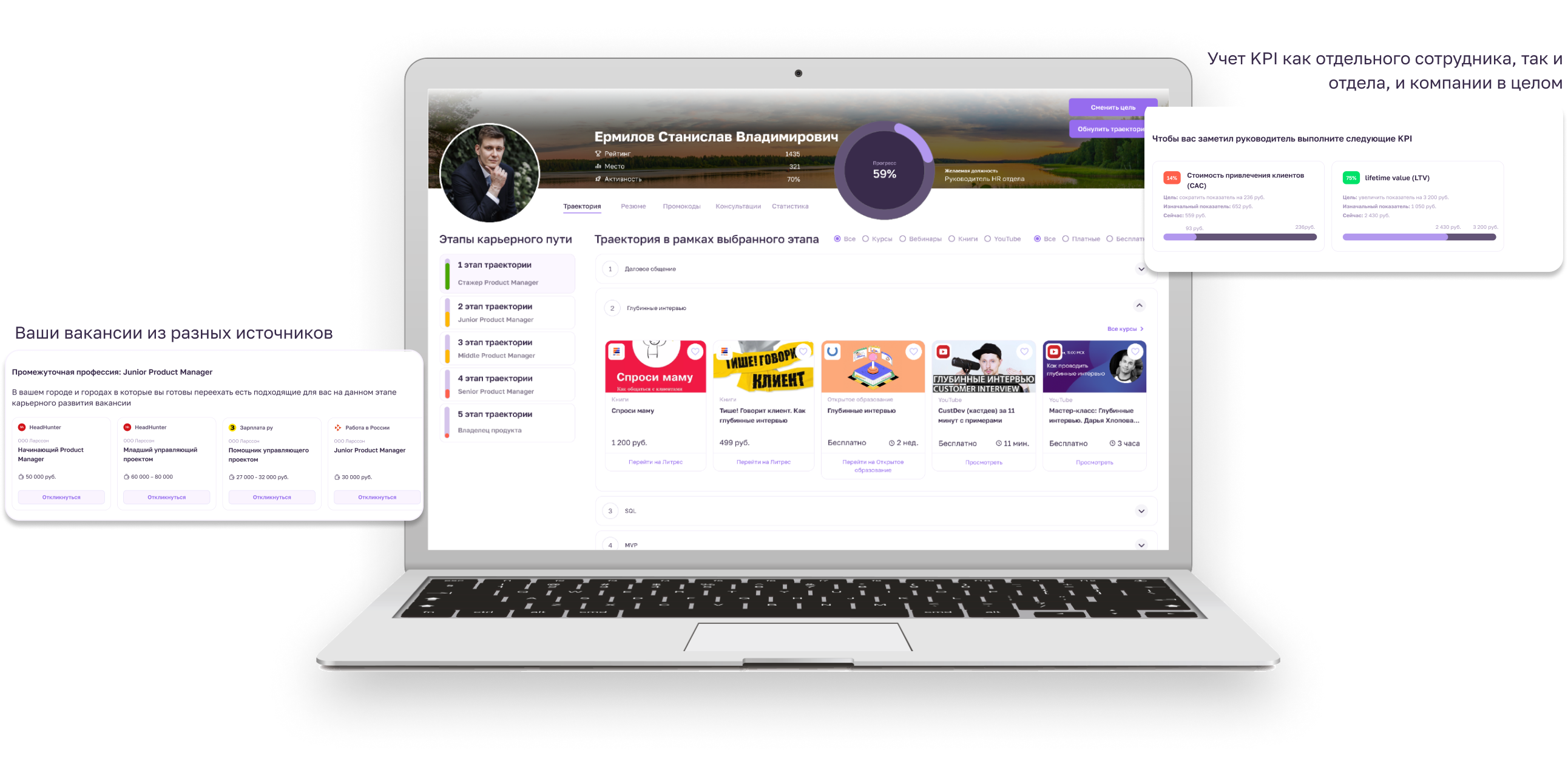 Система расскажет сотруднику о различных профессиях и должностях в компании, их обязанностях и возможных зарплатах. Это поможет тем, кто еще не определился с выбором профессии или хочет сменить ее, не уходя из компании. Если сотрудник уже знает, кем хочет стать, система подскажет, как быстро достичь этой цели.